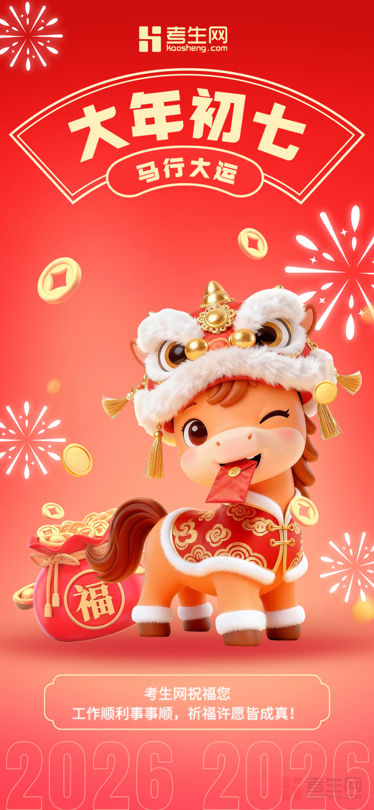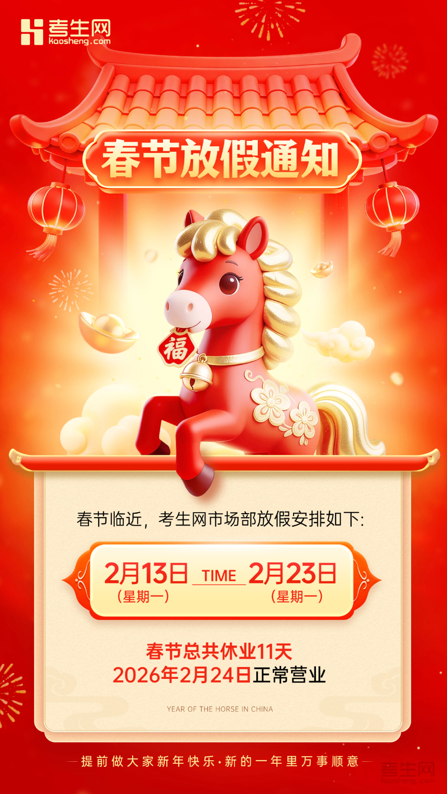 考生网官方定制 2026 马年春节主题祝福海报,全套素材覆盖小年至初七开工全节点,高清无水印,专为公司内部宣传、品牌推广、官方渠道发布使用,统一春节期间品牌视觉形象。
